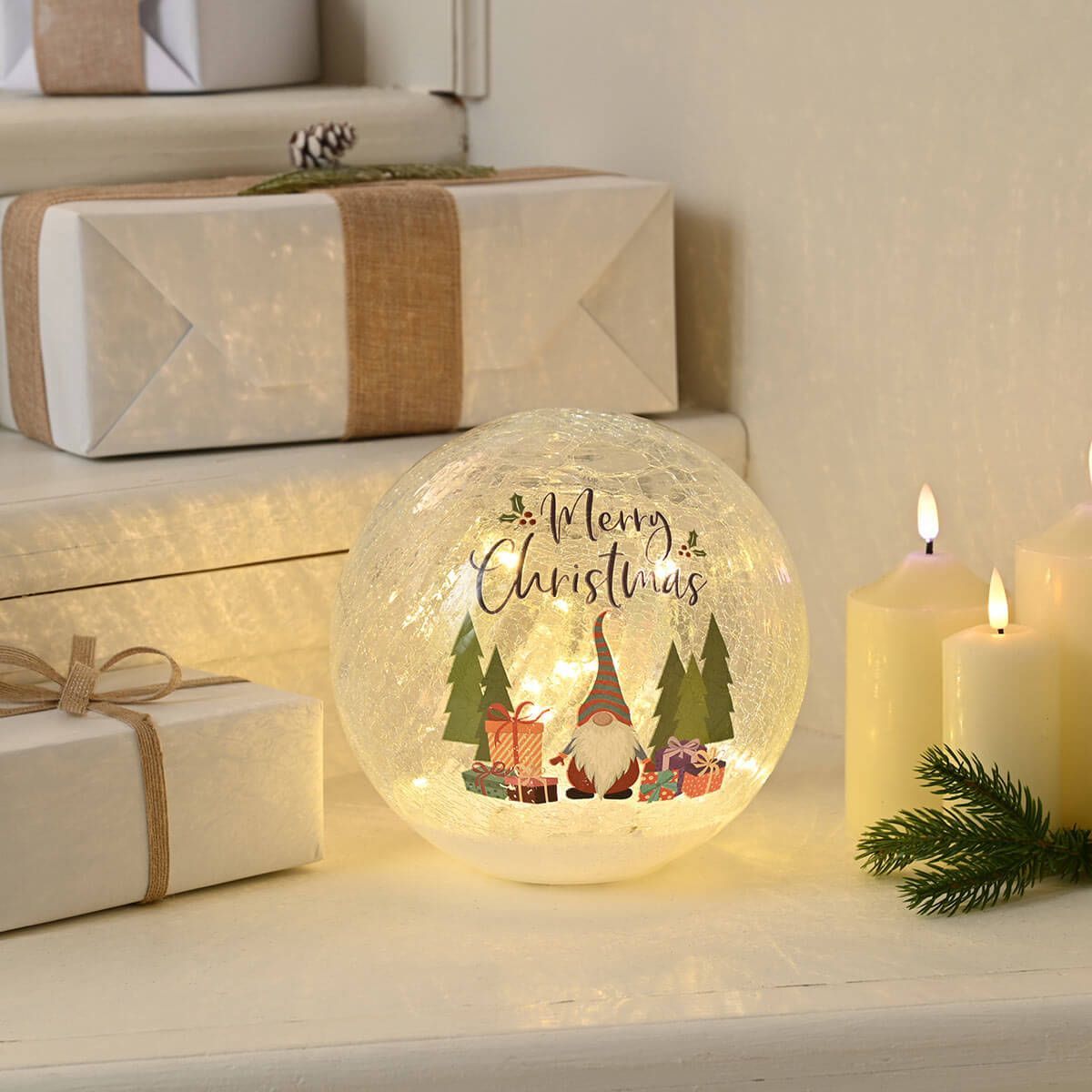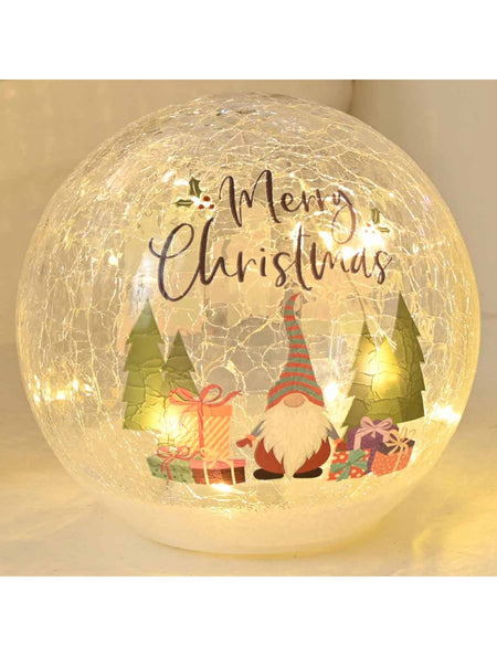 Battery operated clear crackle effect ball with MERRY CHRISTMAS and gonk with gifts scene decal - 12 warm white static led lights inside - requires 3aa batteries (not included)