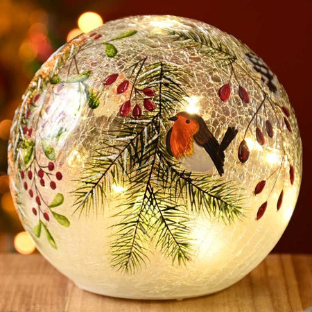 15cm Lit Robin/Berries Crackle Ball Battery Operated
