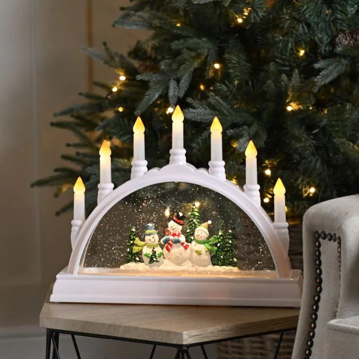 Brighten your festive display with this enchanting snowmanr candle bridge. Featuring a cheerful trio of snowmen surrounded by glittering trees, the swirling water and sparkling lights create a captivating snow globe effect.