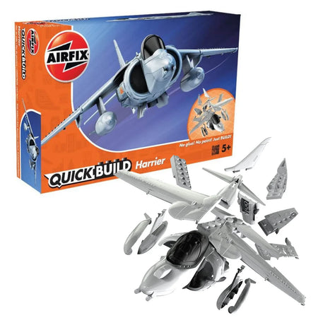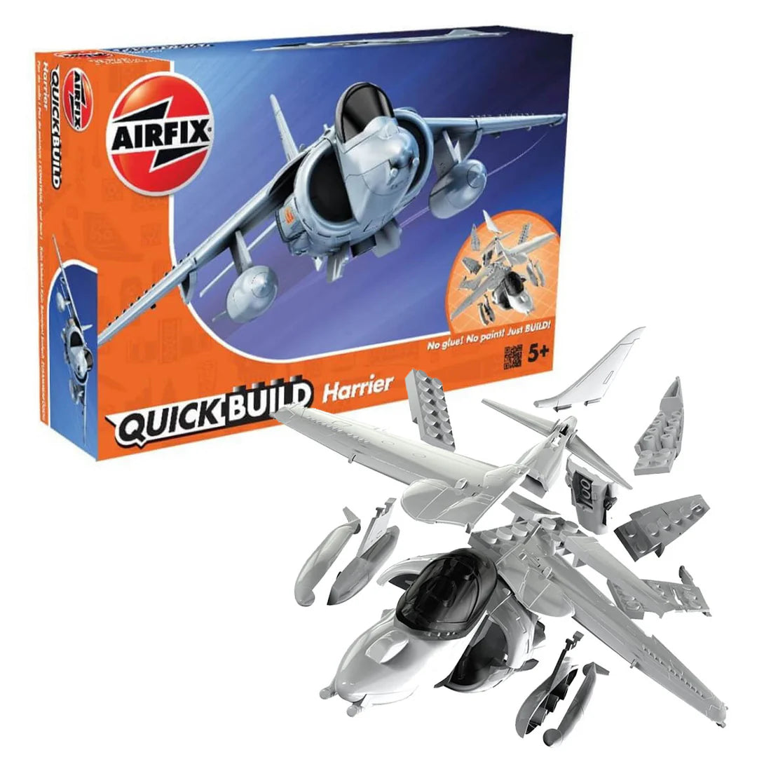 Assemble your own Harrier jet aircraft! This renowned military jet was developed in Britain and is capable to take off vertically so fly your model in true Harrier style. Airfix QUICKBUILD is an exciting range of simple, snap together models suitable as an introduction to modelling for kids (ages 5 and up), or as a bit of construction fun for the more experienced modeller.The pre-coloured pieces simply push together, without glue or paints, to build an impressive model which can then be decorated with the included self-adhesive stickers. This model has a total of 27 parts and is 110mm once mounted on the stand.Plane models also come with their own display stand to show off your handiwork! The whole QUICKBUILD range is manufactured here in the UK and features some of the most iconic vehicles ever constructed!