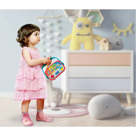 A small, portable radio-shaped activity center for playing with music and having fun with animal friends. Press the buttons to choose your favorite music station and genre!