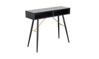Black oak melamine, powder-coated black metal legs, copper metal accents.
