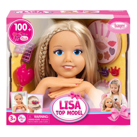 Let your child's imagination shine with the Lisa Top Model Make-Up Head, a 25 cm styling doll with a movable head and poseable hands. Packed with fun accessories like curlers, clips, and make-up, it's perfect for creative play and glamorous makeovers.