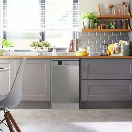 Simplify your dishwashing routine with this freestanding slimline dishwasher. Equipped with four programmes, including the Mini 30' programme which cleans a full load in just 30 minutes, this space-saving appliance is the ultimate time-saving companion. The convenience continues with a Half Load function for smaller dish loads, and a removable cutlery basket adds extra space for larger dishes.
