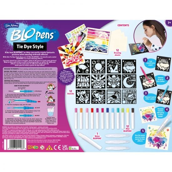 Kids love BLOPENS as they can create fantastic pictures with amazing airbrush style effects. The BLOPENS Tie Dye Style Set includes 12 Mini BLOPENS, 12 Stencils, 12 Drawing Sheet and a water BLOPEN to create amazing effects with. Create cool airbrush tie dye pictures! Perfect for tie dye fans Blow in lines and circles, harder or softer to try different effects Includes 12 Mini BLOPENS, 12 Stencils, 12 Drawing Sheet and a water BLOPEN to create amazing effects with! Suitable for 7 years and over