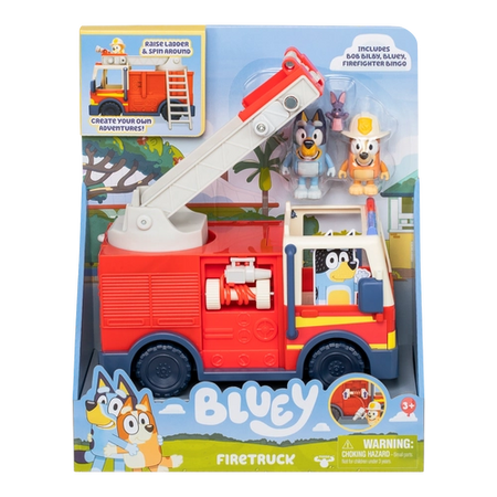 The Bluey Firetruck features a moving ladder that's just the right size for Firefighter Bingo! Place her in the ladder's compartment, raise it up, and spin it around so that Bingo is in the right position to come to the rescue! There is also a second removable ladder on the side of the truck to add to the excitement and adventure.