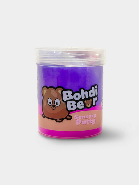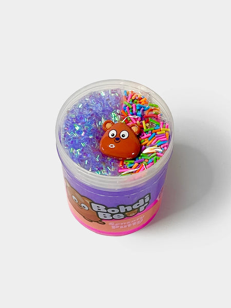 Bohdi Bear Sensory Putty, a delightful blend of purple and pink putty that promises a unique sensory experience. This butterslime-textured putty is not only visually appealing but also gently scented with a caramel fragrance, adding an extra touch of sweetness to your playtime. Each jar is adorned with bingsu beads and clay sprinkles, enhancing its charm and providing a fun tactile element.
