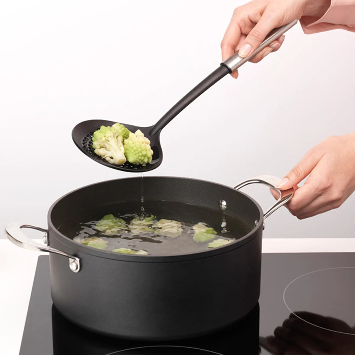 Scoop up and drain veggies, mussels or even French fries with this Brabantia Non-Stick Skimmer. Fat and fluids will quickly run down the holes, so no puddles on your plate. Works wonders for removing meat from stock, and skimming fat off the top of soups or stews too. Don't skim over this one!