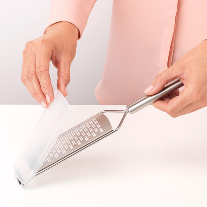 This Brabantia Slice Grater is ideal for Parmesan, cucumber, carrots, etcetera. It will even make you chocolate flakes, adding a sweet touch to your favourite dessert. The anti-slip base and large plate help you grate lightly. And after use you can store it securely because of the protective cover. Happy grating!