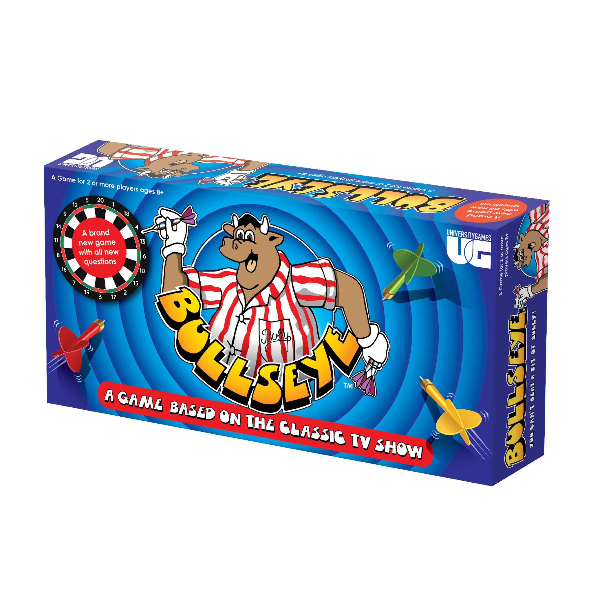 Step right up to this thrilling board game adaptation of the beloved classic TV show Bullseye! Perfect for game nights with family and friends, this fun-packed game brings all the excitement of the original quiz show to your living room. Players can test their knowledge across multiple categories including Science, Sport, Spelling, Music, Films and TV, Places, Books, Words, and History. The game features a dartboard with magnetic darts and hundreds of challenging questions that will keep everyone engaged. Designed for 2-8 players aged 14 and above, you'll progress through exciting rounds towards the grand finale where Bully's Star Prize awaits the champion. The game includes all the iconic elements fans will remember, packaged in a vibrant blue box featuring the famous Bullseye mascot in his distinctive red and white striped shirt. Whether you're a long-time fan of the show or new to the format, this game promises hours of super, smashing, great entertainment for everyone involved!