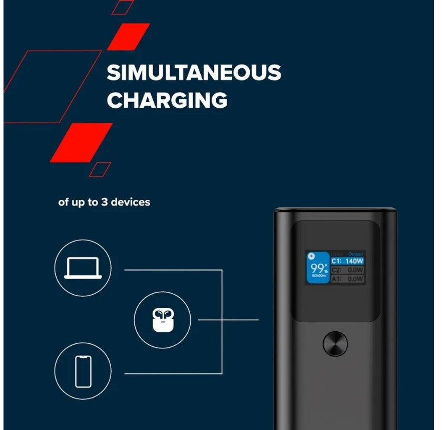 Both Type-C ports can charge your devices quickly and provide fast charging of the power bank itself. All at the maximum rate of 140W by the standards of the Power Delivery 3.1 protocol. This is more than enough for most devices, including high-end laptops.