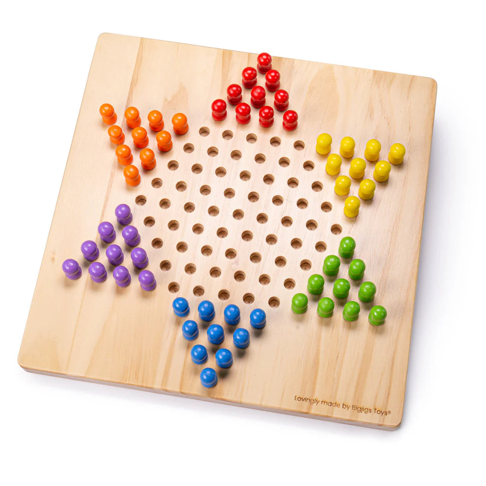 How to play chinese checkers: The aim of this wooden board game is to get your pegs to the star point opposite yours. The first player to do this is crowned the winner. Each player takes it in turns to move their peg forward by moving into one of the adjacent holes or jumping over into a hole two pegs ahead.