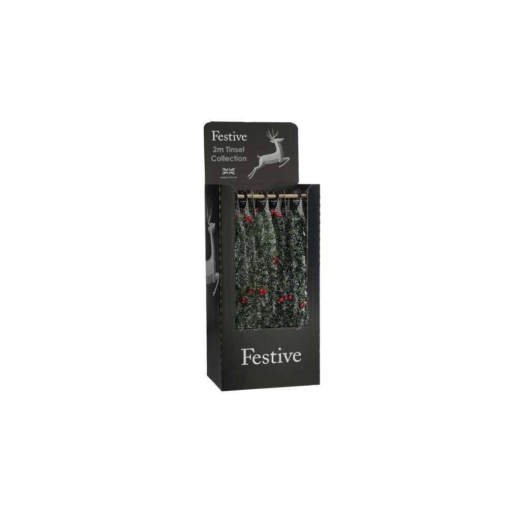 - 2 asstd green with white tips - lite green die cut christmas tree decorated tinsel with red berries - dark green die cut christmas tree decorated tinsel with red berries