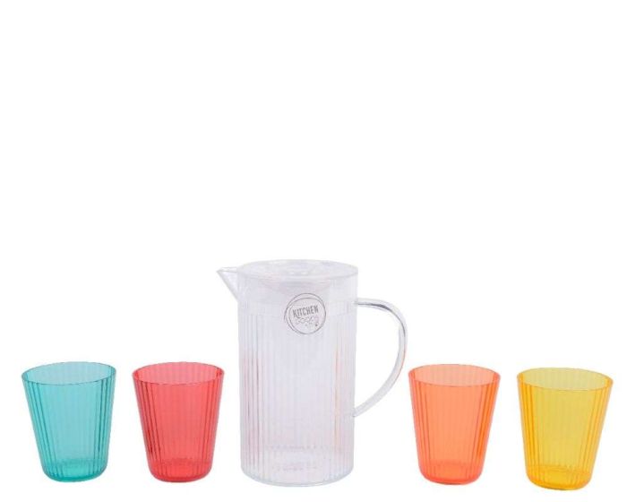 - Vibrant 5-Piece Set: Includes 1 transparent pitcher + 4 cups in yellow, blue, pink, and orange