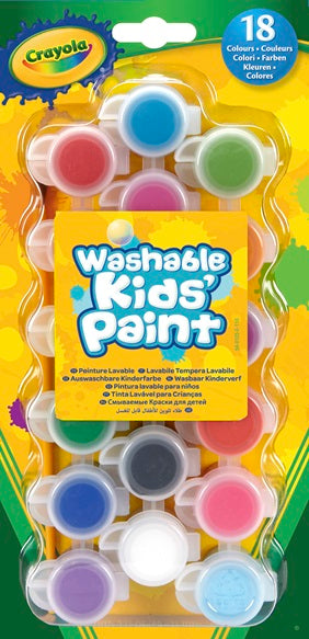 Colours, colours, and more colours! Washable Kid’s Paint is ideal for arts and crafts, posters, and school projects. The paints are easy to apply with brushes, sponges, stamps, stencils, and other tools and they can be used on almost any surface. Crayola's Washable Paint is specially formulated to wash off machine washable clothing. It also washes off walls, carpet and furniture with warm water and a sponge because not everything your child makes is a keeper!