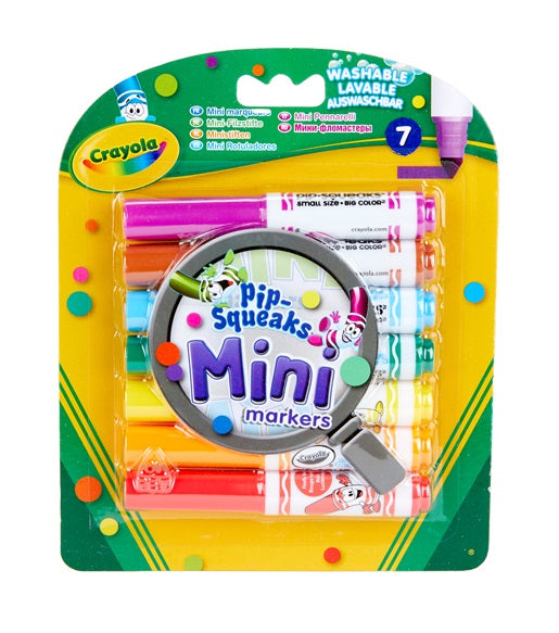 This pack of 7 Crayola Pip-squeaks Mini Markers in assorted colours, contains felt tip markers in small sizes, making them ideal for little fingers. This pack of 7 includes 7 bright colours, including Brown, lilac, light blue, green, yellow, orange, red.