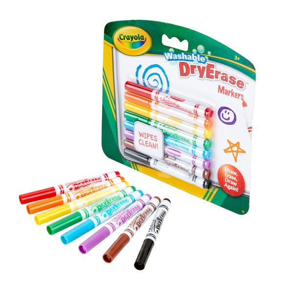 Now kids can enjoy the fun of creating colourful masterpieces without the annoyance of difficult cleanup. These brightly hued, bullet tip point Dry-Erase Markers are made with Crayola's washable ink and is specially formulated to wash off machine washable clothing. It also washes off walls, carpet and furniture with warm water and a sponge because not everything your child makes is a keeper! Includes Black, Brown, Blue, Green, Yellow, Orange, Purple and Red colours.
