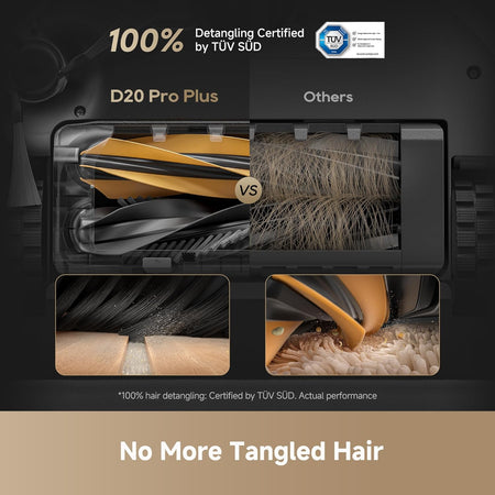 Powerful Suction, Easy Hair Cleanup: Featuring impressive 13,000Pa Vormax suction power, D20 Pro Plus effectively tackles dust and debris on multiple surfaces. Coupled with the innovative HyperStream detangling DuoBrush, it captures hair efficiently while reducing tangling issues.