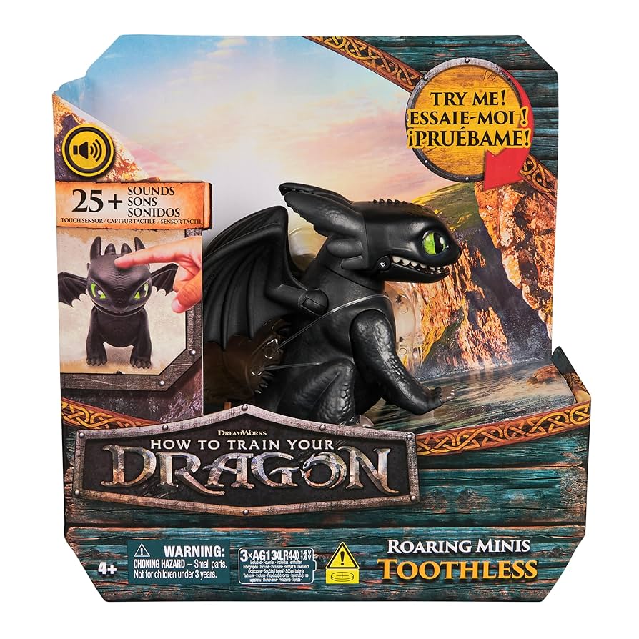 Bring the adventure of How To Train Your Dragon home with the Roaring Minis dragon. Enjoy your very own Night Fury or Deadly Nadder with realistic head movements and authentic movie styling as you get to know your dragon. They comes to life with 25 different sounds as you pet his head. Switch on your dragon and wake him up with a simple touch. This dragon toy is the right size to take on the go or enjoy at home as you experience your very own dragon. Batteries included. Kids can recreate their favorite scenes or invent new stories as they dive into pretend play and sensory play with this engaging dragon figure. Start your adventures with ideal pretend play toys for ages 5-7. Whether it's for a birthday, holiday, or any celebration, this dragon figurine is an exciting option for young fans to inspire imaginative play and heroic adventures. Explore more thrilling adventures with Battle Dragons action figures, flying RC Toothless, board games, toy figures & playsets, Vikings figurines, stuffed animals and plush toys. (Each sold separately.)