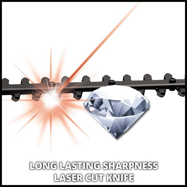 The Einhell GE-HH 18/45 Li T High-hedge Trimmer is perfect for keeping hedges, shrubs and bushes tidy. The metal gearbox provides long duration and the knives made of laser-cut and diamond-grind steel provide clean cutting results. The motor head can be sloped 7-fold and the main handle 4-fold to adjust them to your needs. Battery and charger are supplied separately. Requires 1 x 18V Einhell Power X-Change rechargeable battery.
