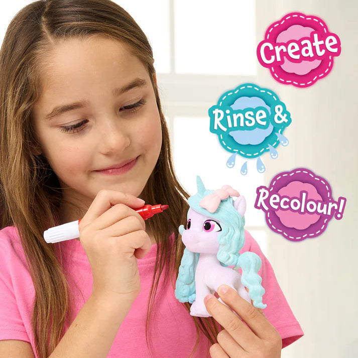 CREATE, RINSE, AND RECOLOUR: My Little Pony Fuzzikins Izzy Moonbow is perfect for kids wanting to express their creativity! Fuzzikins are adorable, flocked creatures to colour in and play with!