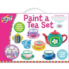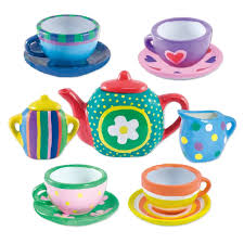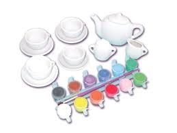 Paint a miniature tea set with colourful ceramic paints. Follow the designs on the box or create your own unique tea set. A fun and creative activity. Contents: white ceramic miniature tea set comprising tea pot, milk jug, sugar bowl, 4 cups, 4 saucers plus 12 x 3ml ceramic paints, paintbrush and guide.