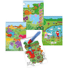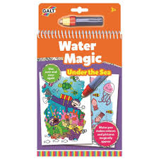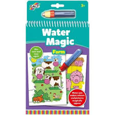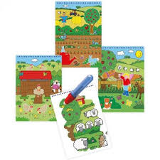 6 reusable pictures on thick board to colour with the water pen. Fill the pen with water and use to reveal the hidden pictures.