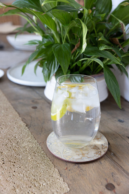 Tea and coffee breaks will quickly become the most relaxing time of the day with these round coasters at the table. Each round coaster in this set of four is decorated with Creative Tops' 'Gold Impressions' design. Delicate filigree patterns sit against a shimmering backdrop of luxurious gold. Most importantly, however, they'll keep your delicate tabletops protected from stains, scratches and heat marks. They're backed with a 5 mm (¼ inch) thick layer of heat-resistant cork. These drinks coasters feature luxury, lacquered surfaces that are wonderfully smooth to touch. They're stain-resistant too, which makes them very easy to keep spotless.