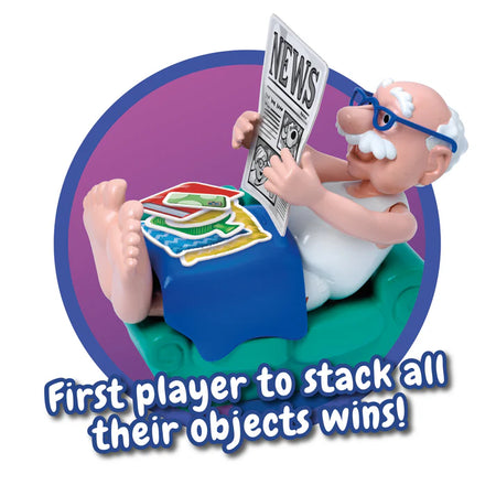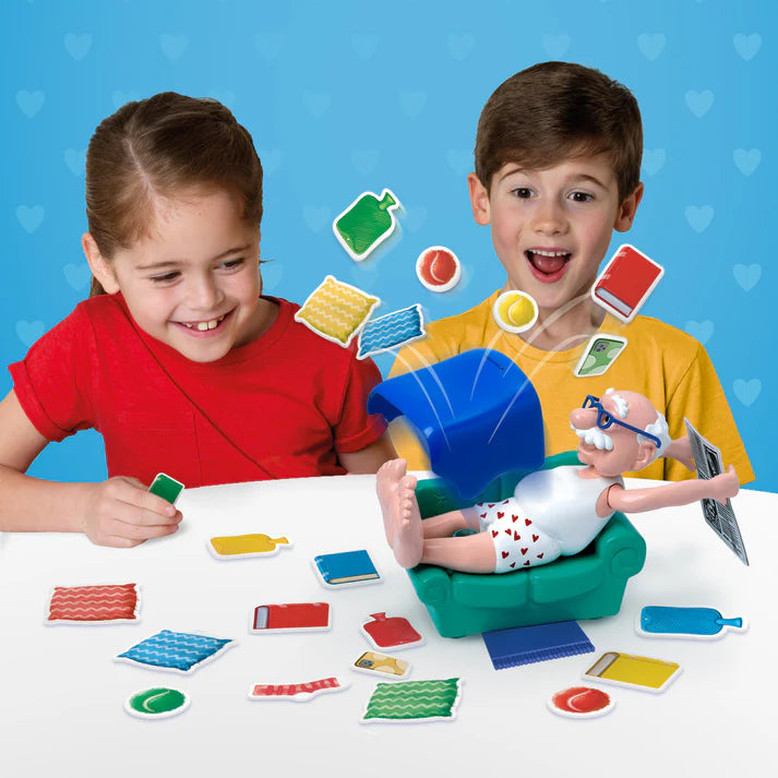 Grandad’s having a rest, but you still want to play! Balance an item on Grandad and give his toes a tickle but watch out…. tickle him too much and he can’t control himself. His newspaper and blanket are sent into the air, throwing your items everywhere! The first player to stack all their items onto Grandad without startling him is the winner