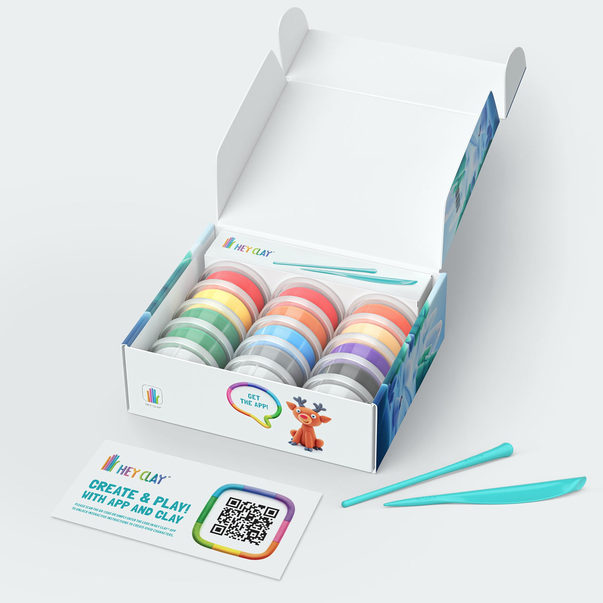 This vibrant clay is soft, lightweight, non-sticky, nontoxic, and stain-free - perfect for young artists taking their first step into the magical world of clay creativity. The fun starts once you download the free app and gain full access using the code included in the box. Pick one of the six playful holiday characters - a penguin, a snowman, a reindeer, a Christmas tree, Mrs. Claus, and of course, the big man himself, Santa Claus. Then, grab the sculpting tools and follow along with the interactive 3D step-by-step instructions to masterfully mold it, one simple shape at a time. Spheres, cylinders, facial features, textures, and more... Kids learn real sculpting techniques without even realizing it! Fill their heart with holiday cheer, one chunk of clay at a time, with the Hey Clay Winter Holidays Set.