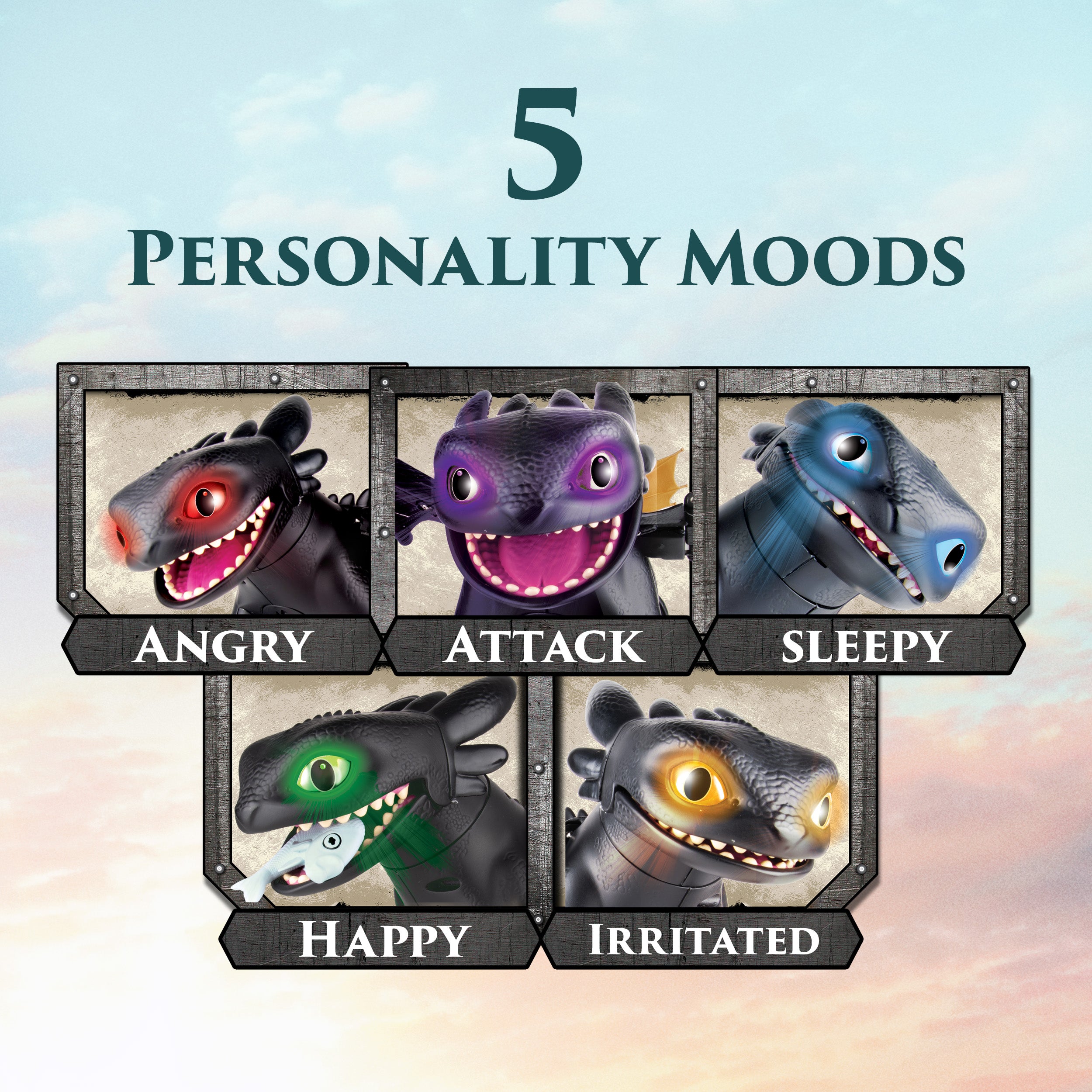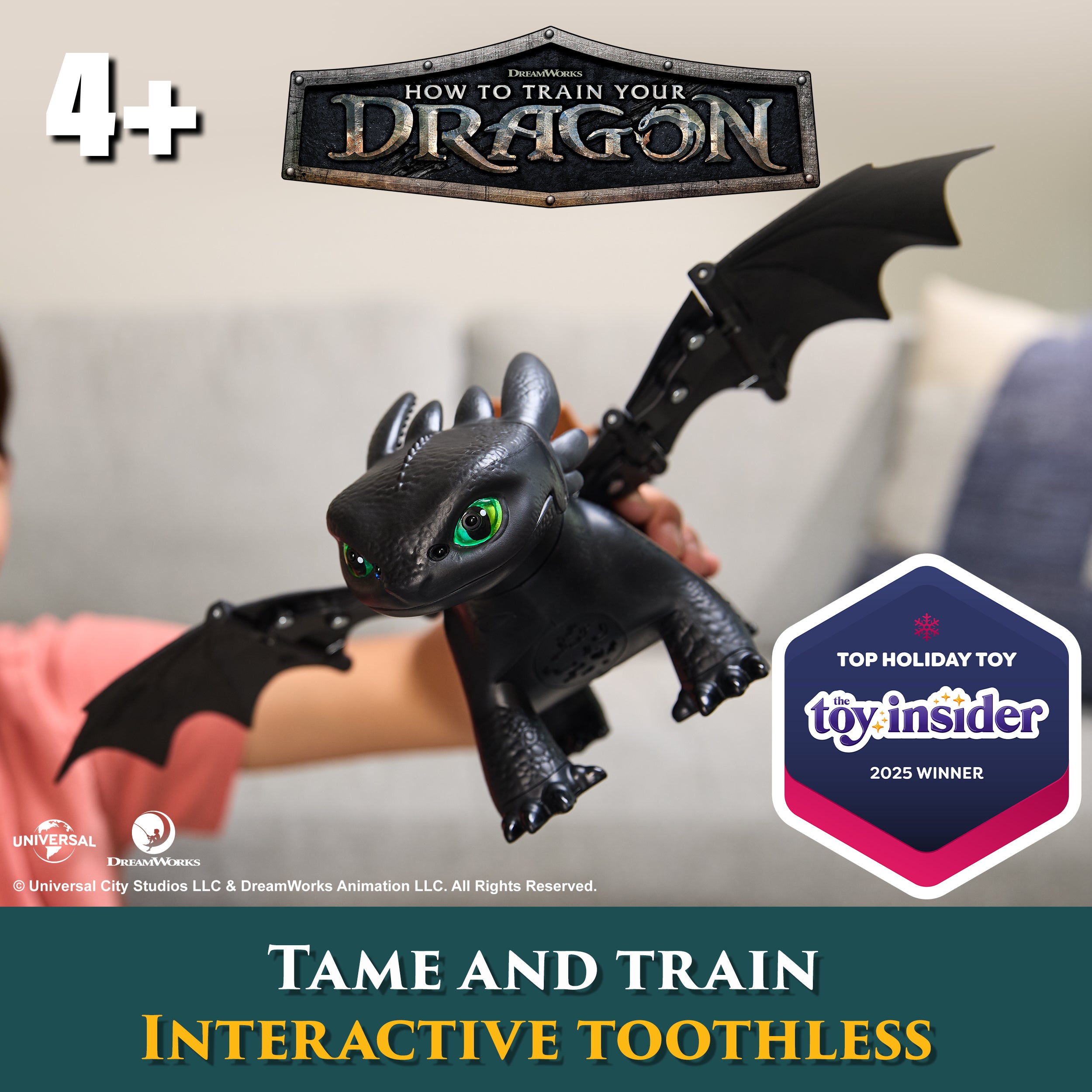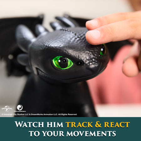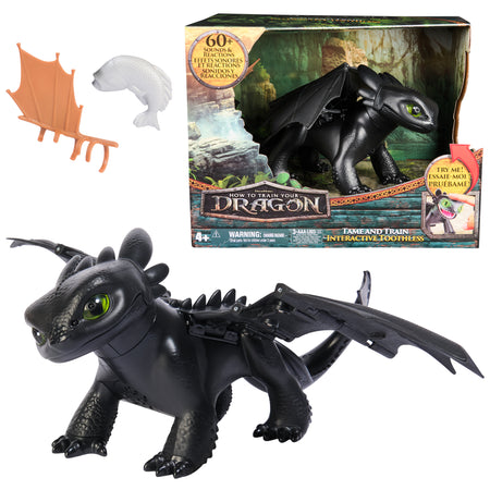 Bring the adventure of How To Train Your Dragon home with the Tame & Train Interactive Toothless dragon toy. Open the packaging “cage” to welcome your very own Toothless, and make sure to grab the fish from the box! Earn his trust by holding his favorite snack, the included fish, as he locks on and tracks the fish and your movements. Grow your bond with Toothless as he goes from wild to tame with 5 different personalities. Unlock games with Toothless like “keep away”, “follow me”, and “chicken” to discover more reactions and sounds from the Night Fury. Achieve the final bond to witness his plasma attack with spring loaded 20-inch wings and blue flashing eyes. Lift Toothless for flight sounds with your newly bonded dragon. Batteries included. Kids can recreate their favorite scenes or invent new stories as they dive into pretend play and sensory play with this engaging dragon figure. Start your adventures with ideal pretend play toys for ages 5-7. Whether it's for a birthday, holiday, or any celebration, this dragon figurine is an exciting option for young fans to inspire imaginative play and heroic adventures. Explore more thrilling adventures with Battle Dragons action figures, flying RC Toothless, board games, toy figures & playsets, Vikings figurines, stuffed animals and plush toys. (Each sold separately.)