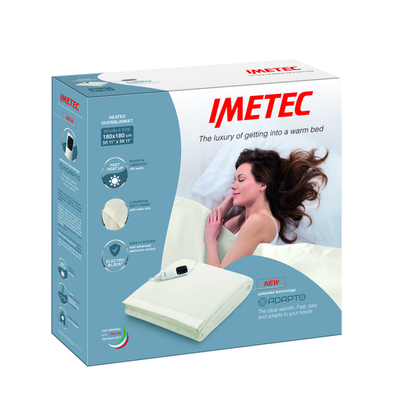 Thanks to advanced software and an innovative digital control system, The Imetec 16738 Adapto Double Overblanket uses all its power to warm up quickly. During the night, it constantly adapts to the natural temperature of the body and the surrounding environment, ensuring the ideal heat for a good night’s sleep.The Luxury Of Getting Into A Warm BedThe Adapto heated over blanket guarantees optimal rest because it creates the ideal climate in your bed and keeps it stable all night, adjusting automatically to your needs.Adapto Patented TechnologyThe new Adapto patented technology ensures fast heating, constant temperature control and maximum safety.Super Soft FabricThe luxury high-quality fabric is finished with a beautiful satin trim and feels soft and comfortable on your skin. It’s perfect for layering over the bed. It's hand and machine-washable.Electro Block Safety SystemThe advanced Electro Block® safety system automatically checks that the product is working properly every time it is switched on and monitors it constantly during night-time use.How To Use Imetec Electric BlanketThe Imetec electric blanket goes between the mattress and the sheet: plugged into the power socket and with the temperature adjusted, it releases heat which rises, heating the sheet and staying inside the bed avoiding any heat loss.