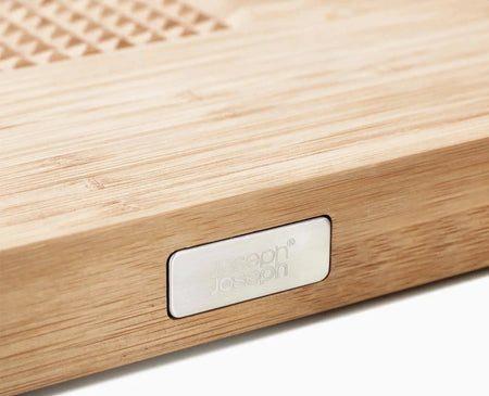 This heavy-duty bamboo chopping board features an integrated food grip to hold your meat, vegetables or bread in place while you cut and has an angled surface to collect any meat juices or breadcrumbs.