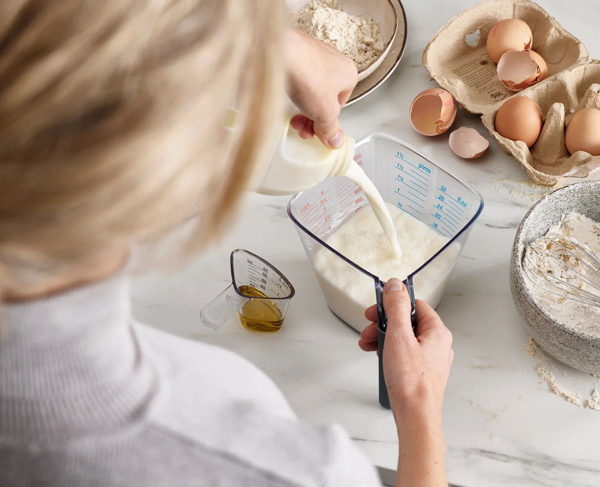 - Measure up to 1 litre / 4 cups / 1¾ pints / 32 fl. oz.