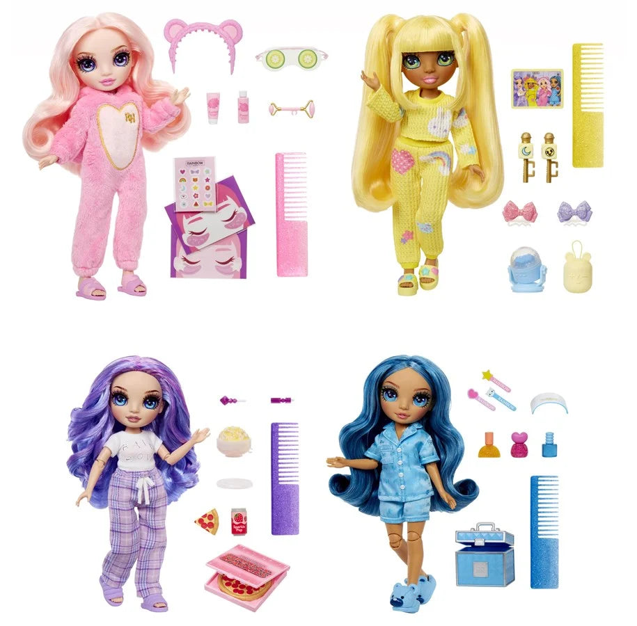 For the first time, your favorite Rainbow High Junior High friends are having an all-night Pajama Party! Each 9” fashion doll comes in their own colorful pajamas, slippers, and the perfect PJ party accessories.