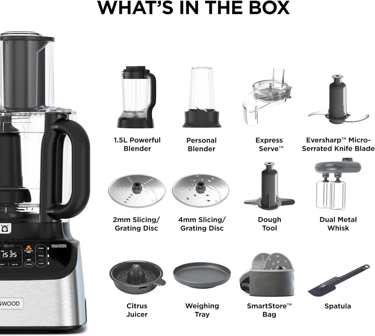 3-in-1 food processor, blender and personal blender. Including automatic pre-sets, to prepare ingredients with just one touch, and a powerful 1000W motor. With the original all-in-one solution from Kenwood you can weigh, mix, knead, puree, chop, grate, slice, blend, juice, whisk and even crush ice.
