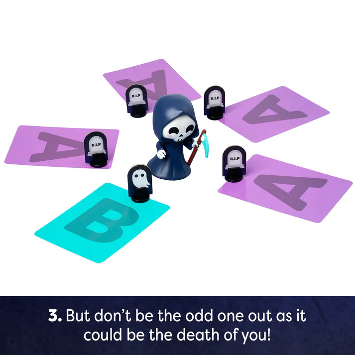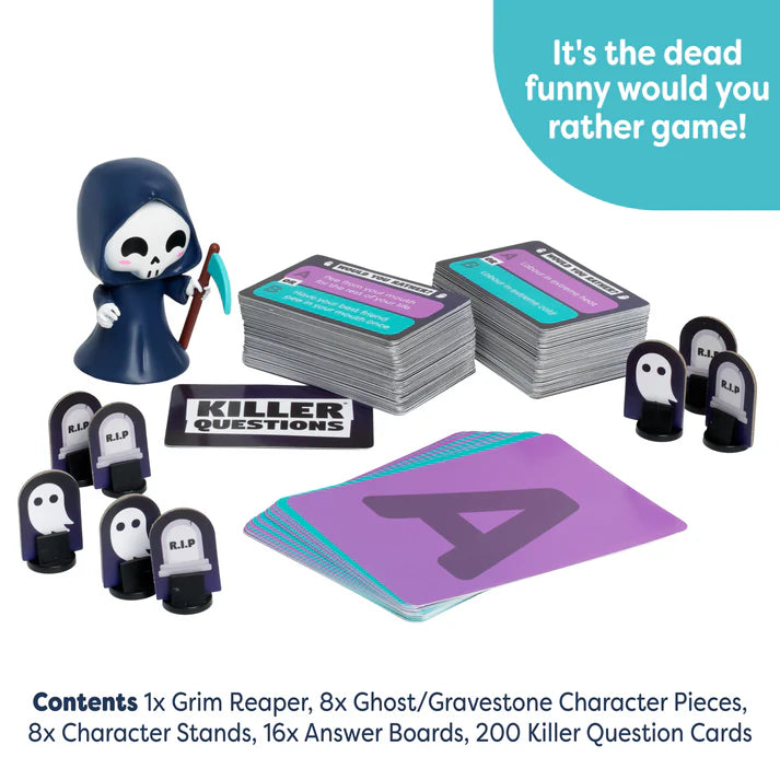 Contents: 1 x Grim Reaper, 8 x Ghost/Gravestone Character Pieces, 8 x Character Stands, 16 x Answer Boards and 200 Killer Question Cards