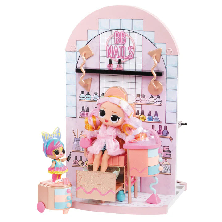 Ready for the ultimate spa day B.B.s? Check out the all-new LOL Surprise Shine On Salon & Spa. This 5-n-1 playset includes: a spa with a working waterfall, a hair salon with a light-up mirror, a working hair washing station, a nail salon, and a juice bar. Unbox 65+ surprises including hair styling accessories, working face masks for your LOL Surprise dolls, and more for the best experience in interactive glam play with your divas!