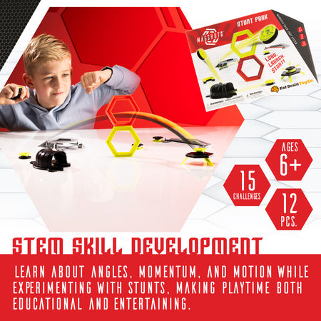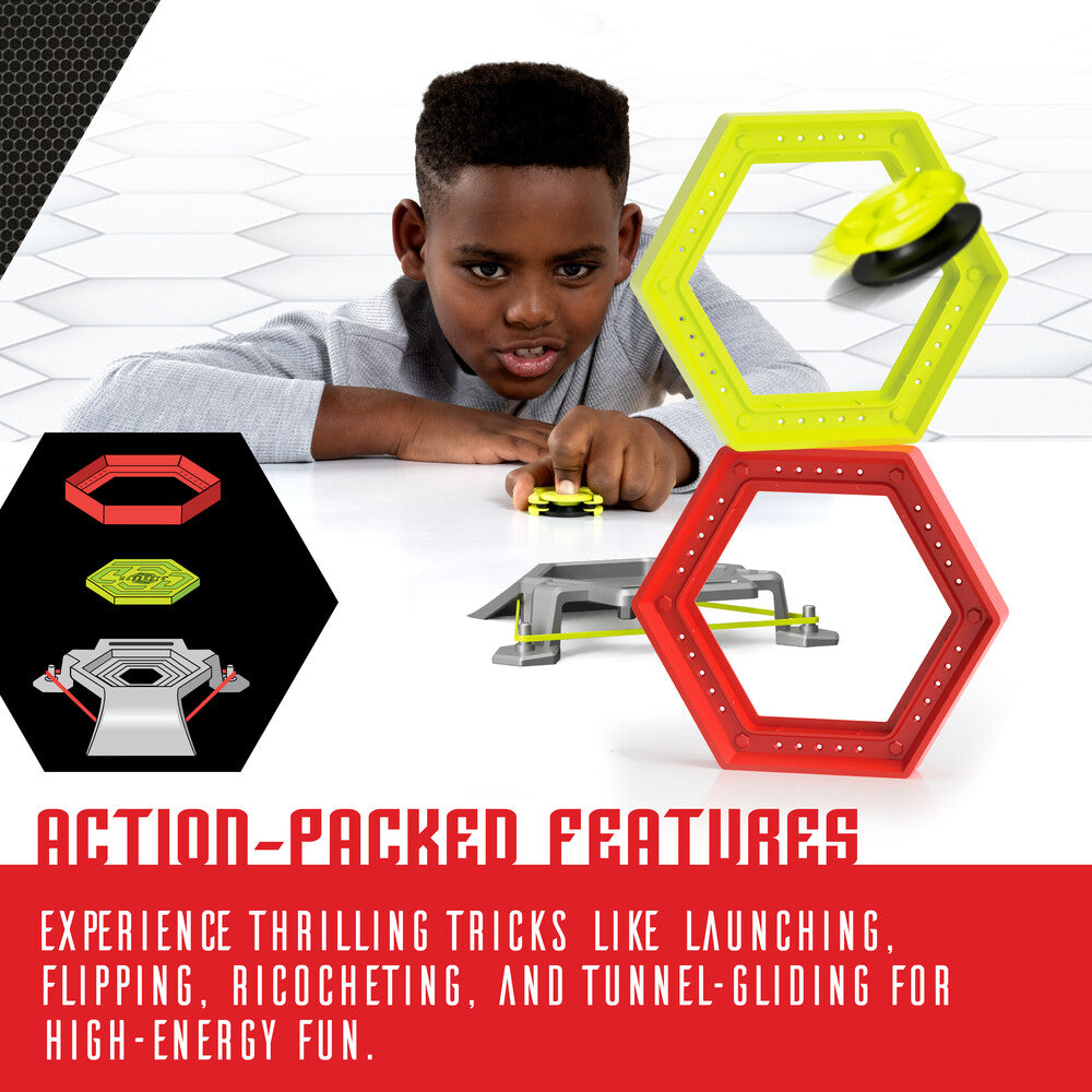 - Includes Stunt Module, Mag-Module, 2 Hex Rings, Tunnel Ramp, Rebounder, Launcher, 5 Mag-Pods, 15 challenges, reusable sticky pads
