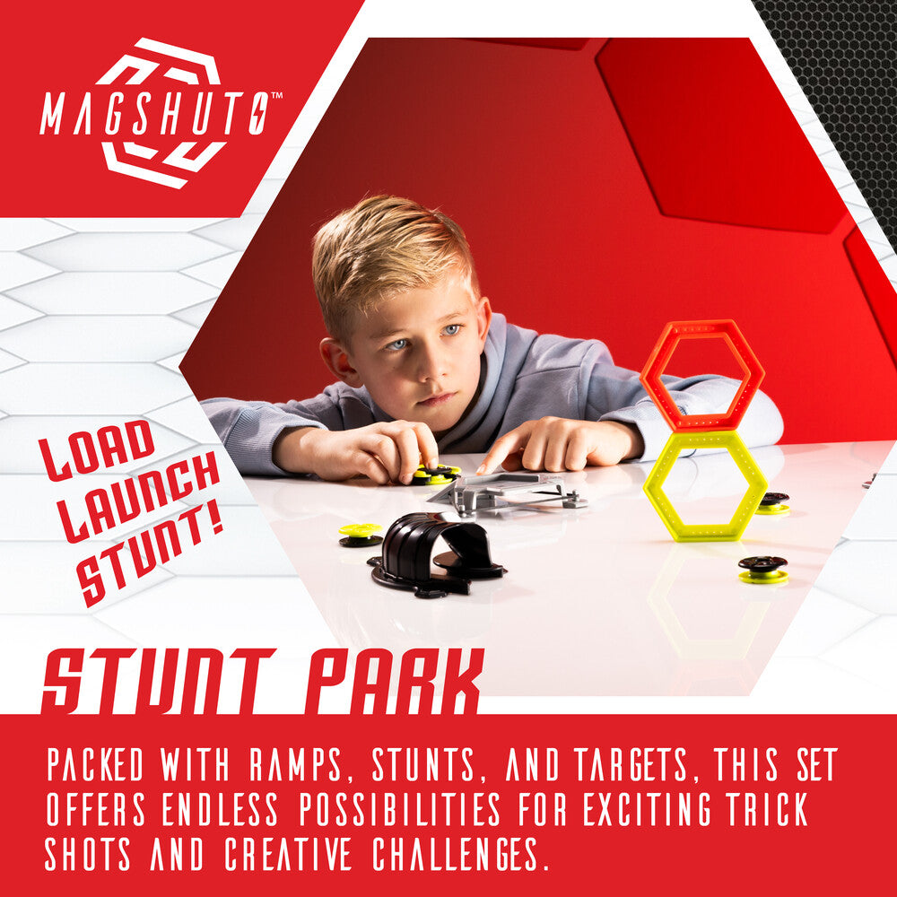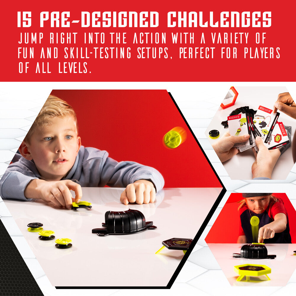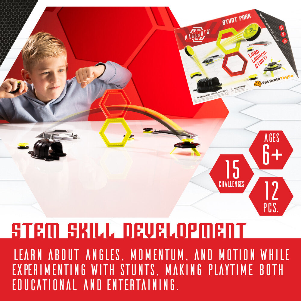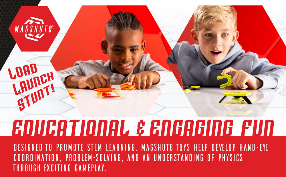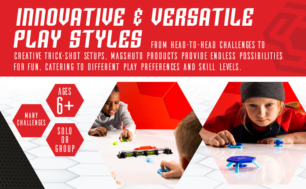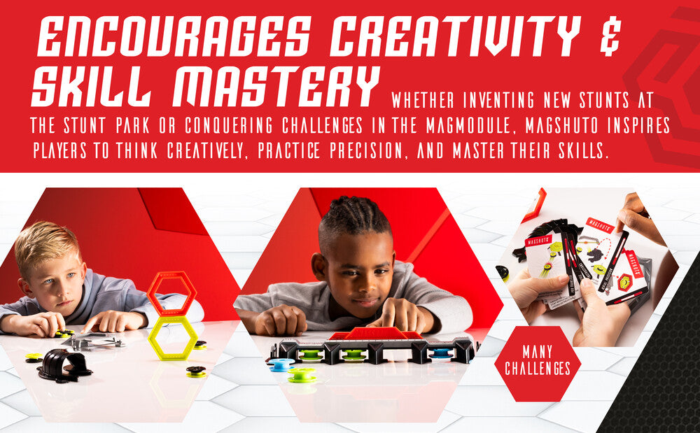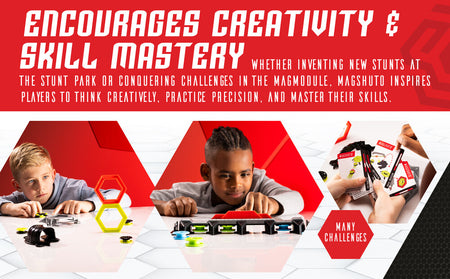 Ricocheting, rebounding, flipping, colliding, flying, tunnel-gliding, and more... Take on the 15 included challenges. Invent your own stunts. Combine with other Magshuto sets and incorporate your environment.
