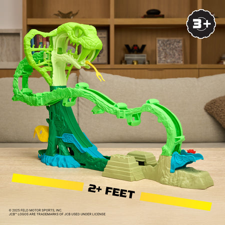 Launch into chaos with the Monster Jam, Cobra’s Crazy Escape playset. Loop into action with 2 exclusive Mini Jam trucks, ThunderROARus and JCB Digatron with gem themed details. This motorized 28-inch-long playset delivers endless excitement as you load in your trucks into the looping jungle track. (Batteries not included) How many trucks can you load into this playset? The more trucks you add, the more action you bring! Watch as your trucks flip and loop in this winding maze. Lift the hidden door lever to help your monster truck toys speed to safety through the side exit. Store and display up to 6 mini trucks as you watch them escape this maze. With so many other Monster Jam trucks to collect, add Grave Digger, Max-D, El Toro Loco and more (each sold separately) to your collection and race them all! Monster Jam toys like remote control cars and more to bring the excitement home. Bring the action with the Monster Jam Cobra’s Crazy Escape playset.