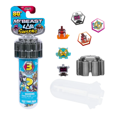 MrBeast’s lab experiments have unleashed epic Micro Beasts! Kick off your collection with the Test Tube Three Pack, featuring 3 mystery Micro Beasts from the 80+ Battle Fusion Series. Test, trial, and train them to discover the most powerful Swarm. Then use the Fusion Cap to connect, stack, and display your lineup in battle-ready formation - prepped to take on the Shroud!!