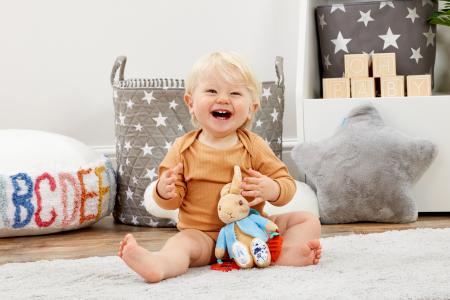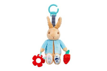 Playtime with Peter Rabbit! There's plenty of fun and games to be had with the fun-packed Peter Rabbit Activity Toy. Designed to stimulate baby's senses and encourage early sensory development, this super soft toy rattles and squeaks as baby plays, and features an attached teether, crinkle-sound fabric, different textures and silky tags for little fingers to explore. Complete with a handy clip hook to attach to bags, buggies and cots, the Peter Rabbit Activity Toy will keep your baby busy when you're on the go, and is the perfect companion for adventure-filled days!