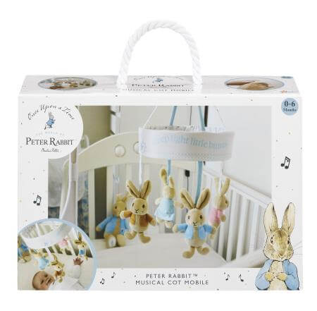 This beautiful Peter Rabbit musical cot mobile features four characters from the original tales of Beatrix Potter. Peter Rabbit, Flopsy Bunny, Benjamin Bunny and Cotton Tail hang from a circular fabric mobile with cute "Sleep tight little bunny" wording. This mobile has a traditional wind up music box and the four characters rotate gently as it plays a soothing lullaby. This mobile is easy to assemble and the plastic arm can be adjusted to fit securely between the bars of the cot. Plays Brahms Lullaby.