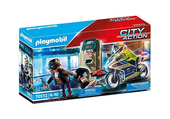 Under the cover of darkness, a pickpocket has broken into an ATM, now he flees with the prey. But a fast police officer has already taken up pursuit with his motorcycle. This thief will not get far! The playset contains two PLAYMOBIL figures, a motorcycle, an ATM, a crowbar, a sack, banknotes and many other extras.