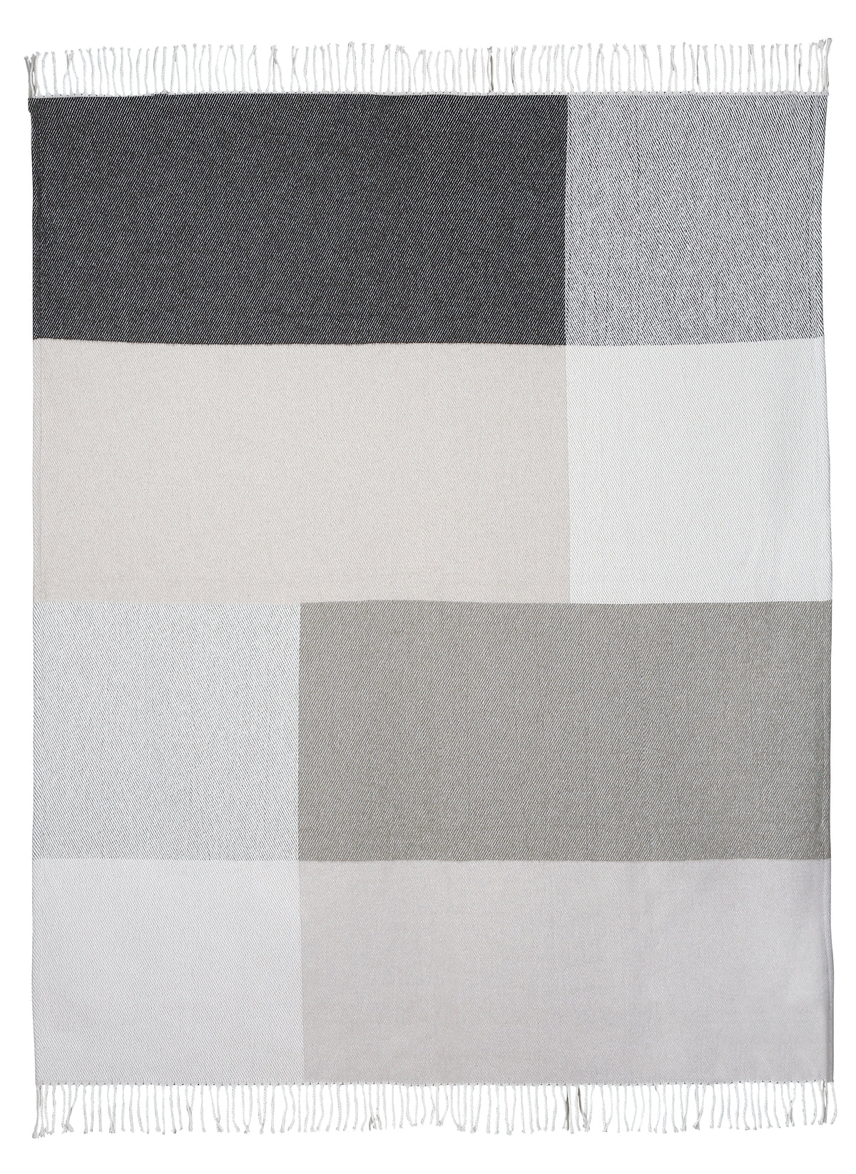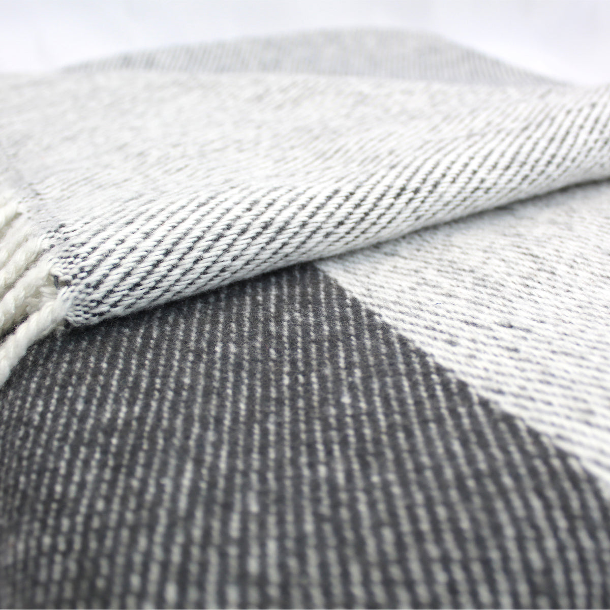 Made from soft and cosy recycled cotton yarns with an all over zig zag print. Grey tassels at the ends completes the look