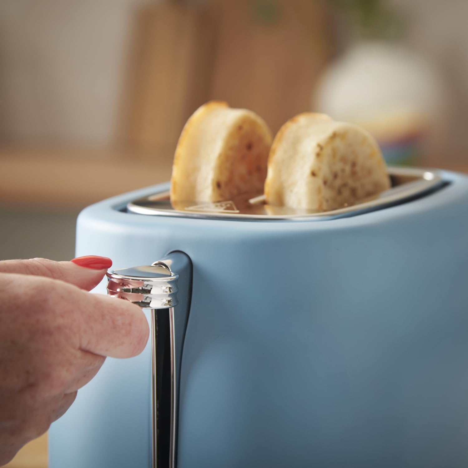 VINTAGE DESIGN – Stylish 2-slice stainless steel toaster (930W) with matte blue finish and chrome accents for a modern kitchen look.