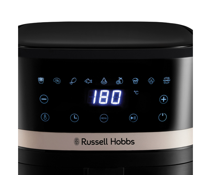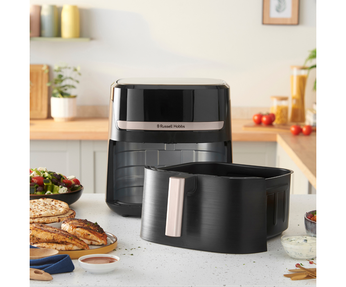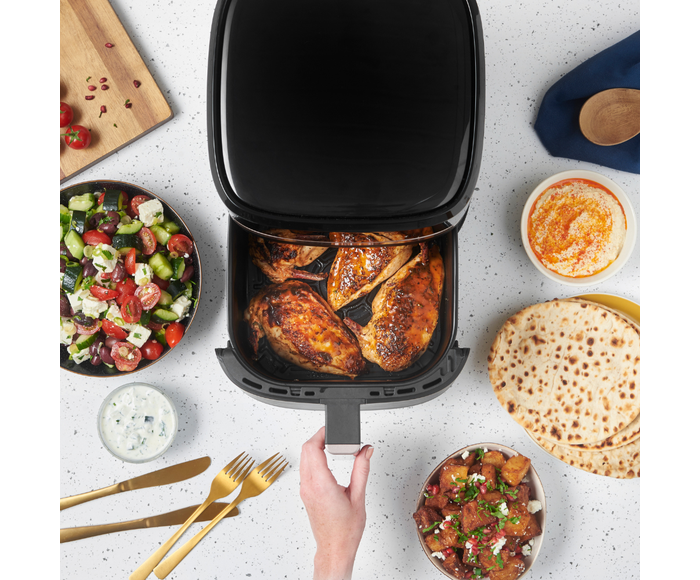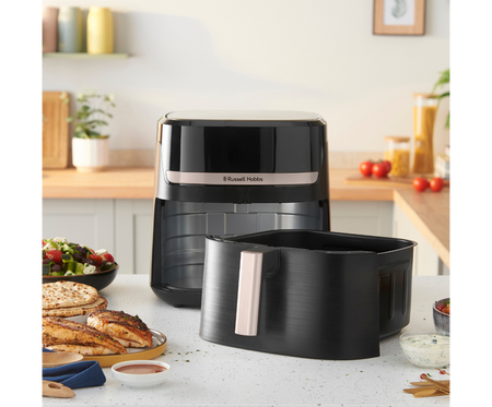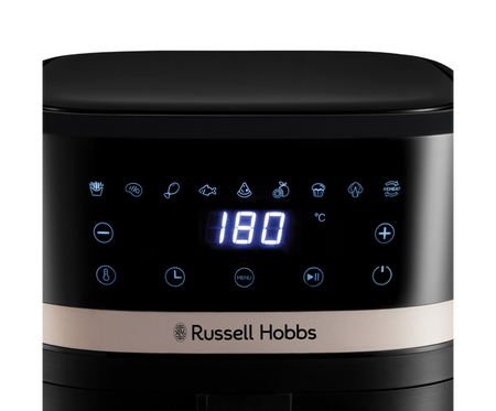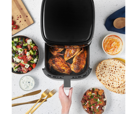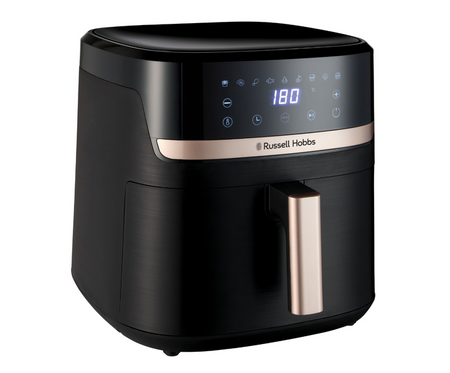 The Satisfry™ 8.3 litre Air Fryer is the ultimate one-stop cooking appliance. With enough room to roast a large chicken or bake several big jacket potatoes, it will satisfy all appetites. And while it handles the big menu items, it looks great on your worktop with its curved black casing and on-trend Champagne accents. When you want to tweak the temperature to perfect a recipe, use the variable temperature controls, or when you’re short on time and need a quick fix, trust 1 of the 9 pre-set cooking functions to get the job done. It's easy to reheat last night’s leftovers or bake a succulent salmon steak at the touch of a button with a variety of cooking options at your fingertips. The crisping plate and basket are dishwasher safe, so clean-up is just as quick and easy.