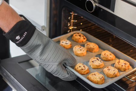 Safely deal with hot trays and pans in the kitchen. The MasterClass silicone oven glove provides the perfect blend of comfort and protection. The glove is made from LFGB-grade silicone, with a seamless design and an extra-long cuff. It's heat resistant to 250°C (482°F), as well as waterproof - providing protection against steam, water splashes and oil spatters. The cuff ensures wrists are safely covered. Maintaining a firm and comfortable hold over cookware and kitchen utensils is easy too. It's flexible, non-slip, and designed to provide maximum grip. And when it's dirty? It can be brought back to its best in the washing machine.