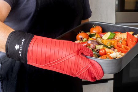 Handle hot baking trays, roasting pans and lots more with complete confidence. This MasterClass Seamless Silicone Oven Glove with Cotton Sleeve makes to easy to maintain a tighter, more secure grip without being burnt. This single oven glove's silicone grip is made from high grade, LFGB-approved silicone. Extremely flexible, it provides you with the freedom to comfortably pick up trays and pans right from the oven. It's heat resistant to temperatures as high as 250 degrees Celsius / 428 degrees Fahrenheit. With its seamless design, this silicone grip is also water resistant. You can use this oven glove to lift the lids from boiling hot saucepans, covered roasting pans or casserole dishes. It's also great for picking up foods or utensils submerged in hot water, providing you with protection against steam and liquid burns. There's no need to worry about your wrist or lower arm being burnt as you reach into the oven. The glove's long cotton cuff provides additional protection against the heat. It's really easy to clean if it becomes dirty or oily too. You can simply pop it in your washing machine. Silicone doesn't absorb flavours, stains or odours either, so clean means clean. More Features · Made from high grade silicone approved to the highest European LFGB standard · Ideal for everyday use - heat resistant to temperatures as high as 250 degrees Celsius / 428 degrees Fahrenheit · Silicone grip's seamless design makes it water resistant · Non-absorbent - doesn't absorb stains, odours or flavours · One size fits all · Features a long cotton cuff to protect wrist and lower arm from burns - measures 96 x 19 cm / 37.5 x 7.5 inches · Comes with MasterClass's five year guarantee against faulty workmanship or materials